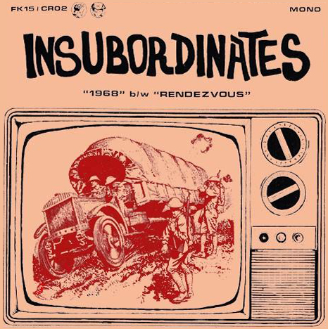 Debut release from Rochester NY's Insubordinates, who (along with other acts like Rational Animals, Bad Taste, Brain Car and more) are part of a vital and undeniably punk scene thriving in that small city. Exciting things coming from Rotcore, I am warning you to pay attention now. Firstly, these aren't just a bunch of piss-pantsed kids drooling all over mics and guitar (although they do that as well), there is a vision at work here. Everything about this single is analog, from the recording, to the mastering, to the printing (which looks amazing). Even the art proofs for the screens were made with an analog photocopier, I shit you not. "1968" is political satire (and a perhaps even satire on the political punk song in general), possessed of a young and dark Agent Orange-esque punk feel. Frantic. In true oldies fashion they populate the B-Side with a shadowy surf-punk instrumental. A good record from a great scene and a harbinger of things to come.(RK)